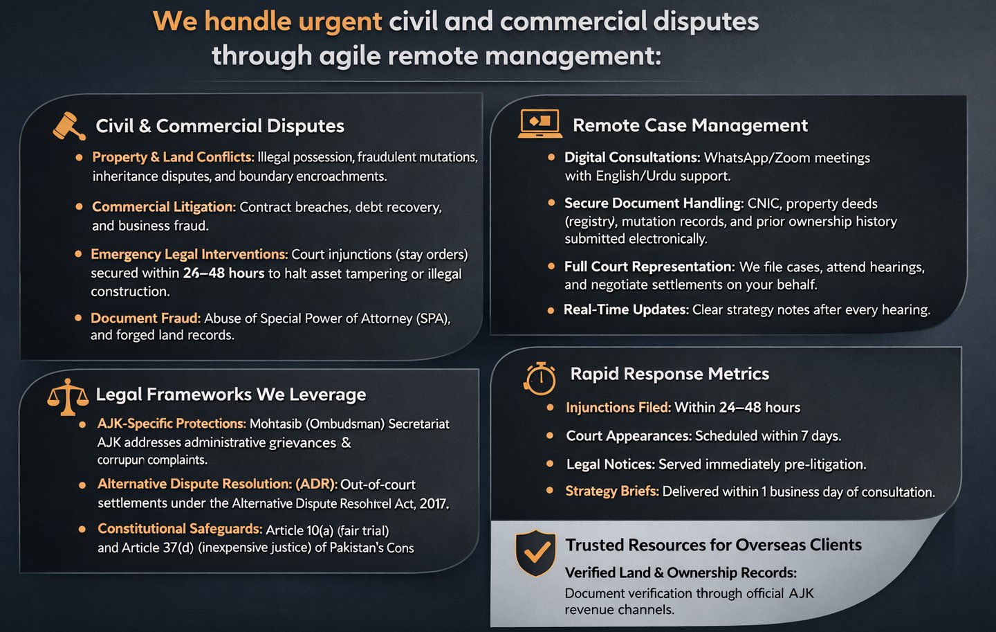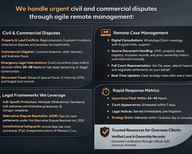Specialist Civil & Commercial Legal Services for AJK and Pakistan, delivered by Barristers and Senior Supreme Court Advocates.
